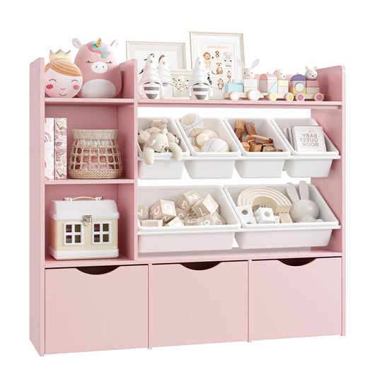 PINK HAVEN Kids Bookcase with 6 Storage Bins, Multi-Purpose Toy Organizers Bookshelf with 3 Drawers for Bedroom Nursery Playroom, Pink